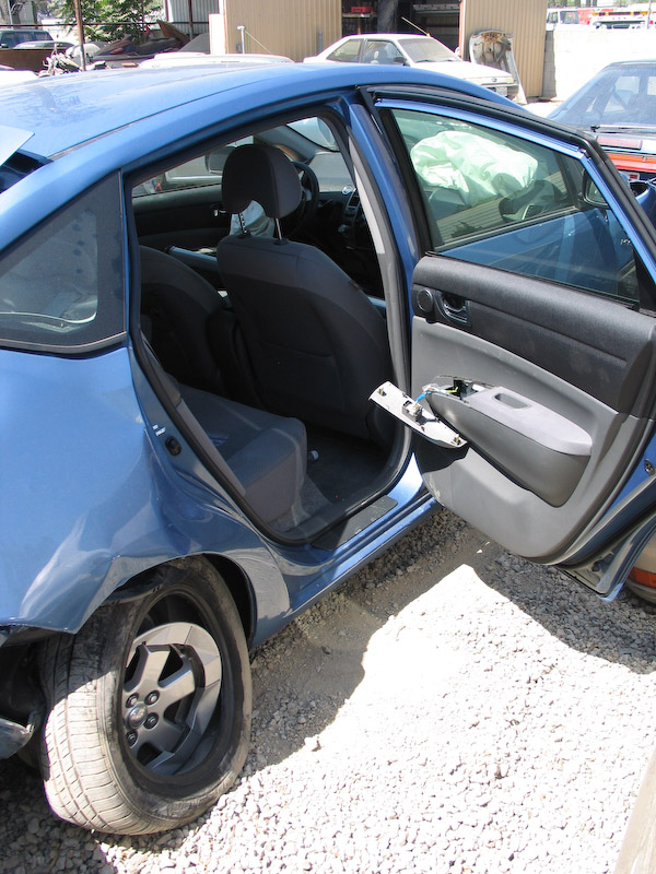 Scrapyard pictures of my Toyota Prius, totalled after it was rear-ended on the 91 Freeway (and then hit again by a large truck on the drivers-side front after the initial collision spun us into the adjacent carpool lane) in Riverside. We were travelling around 65 mph when we were hit. The three people inside (my dad, my brother, and I) all walked away with nothing more than minor scrapes and bruises.
