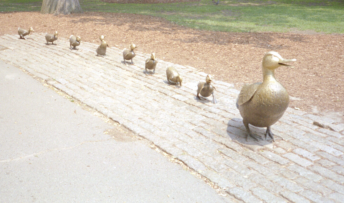 After riding the swan boat, we went to pay our respects to the Make Way For Ducklings statue elsewhere in the park. ( MWFD is a famous children's book about a family of ducks who make their home in the Public Garden.)