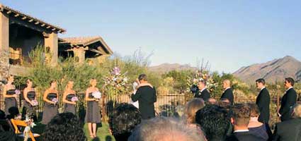 On Saturday evening, we went to the DC Ranch Country Club for Erica and Jason's wedding. The setting was wonderful; outdoors with a sweeping vista of desert and mountains in the background. The weather had cooled down nicely from the past few days (although we later found out the male half of the wedding party had ice packs under their tuxes, just in case.)