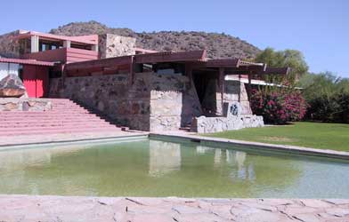 | On the morning of the wedding, we went to visit Taliesin West, a complex of buildings designed by Frank Lloyd Wright between 1937 and 1959. During FLW's lifetime, Taliesin West was his winter home (the original Taliesin is in Wisconsin); today Taliesin West is still the winter home for the Frank Lloyd Wright School of Architecture and the Taliesin Architects, as well as being the full-time home for the Frank Lloyd Wright Foundation. |