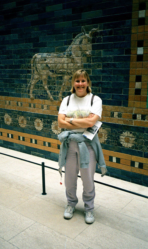 After the Bundestag, we visited the Pergamon Museum, home to all kinds of gigantic structures hauled in pieces from the Near and Middle East (back in the days of Indiana Jones-style archaeology) and reconstructed in Berlin like this processional gate from the city of Babylon, behind Shelby. |
